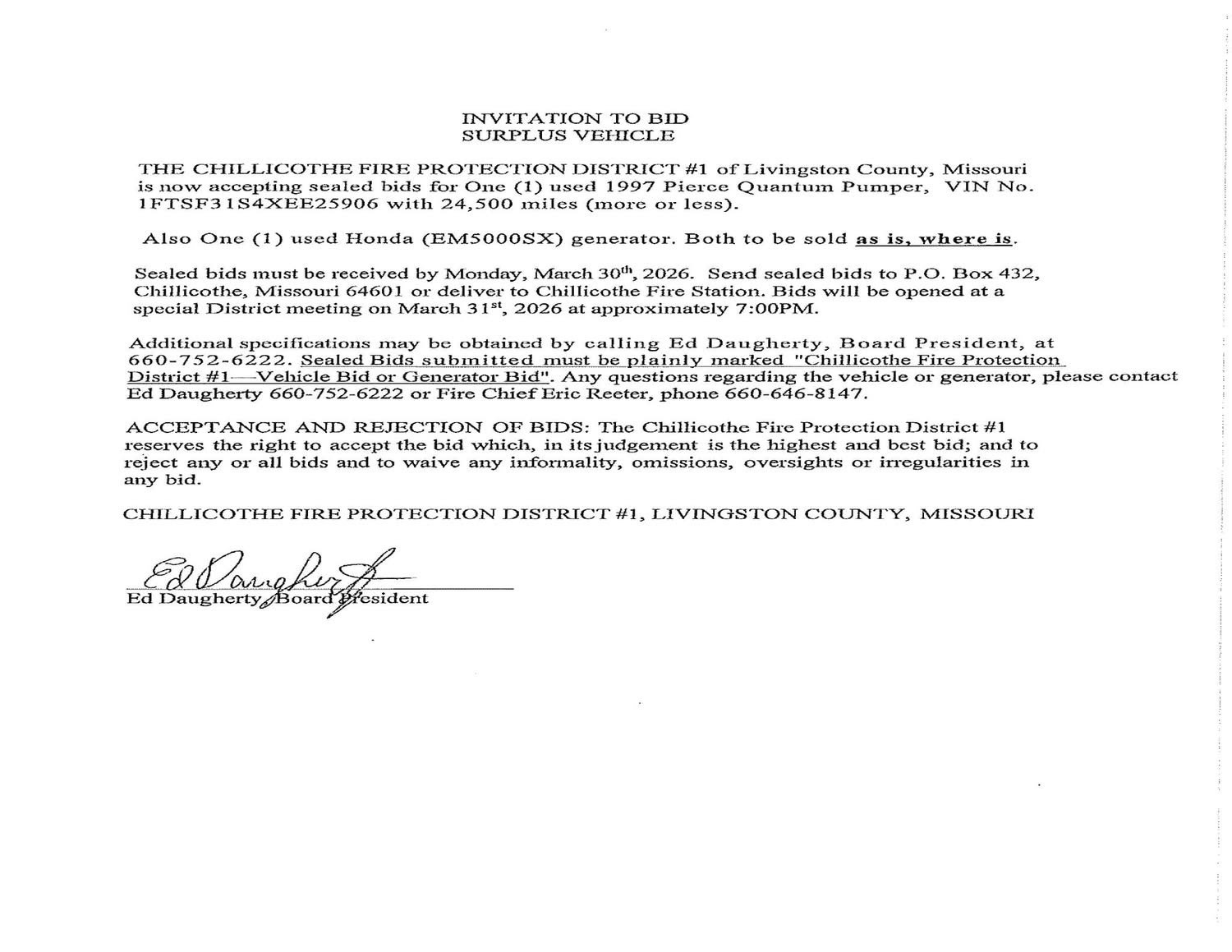 1997 Pierce Quantum Pumper. Sealed bids due March 31, 2026. See attached for more information.