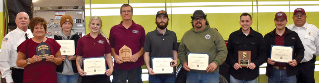 Left to Right: Chief Jennings; Firefighter Dawn Keenan – 40 years; Firefighter Elane Runyon – 5 years; Firefighter Emma Smith – 5 years; Lieutenant Doug Brookshier – 20 years; Firefighter Domanic Voss – 5 years; Lieutenant Jerrad Kelly – 10 years; Firefighter Kenaniah Feltenstein – 15 years; Firefighter Jonah Kovac – 10 years; Assistant Chief Bennett