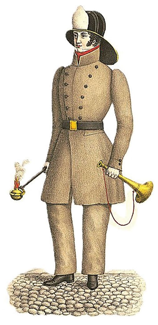 As in previous chapters, this one draws on extensive archival research from the past. When quoting original documents or referring to “Firefighters” in a historical context, the term “Firemen” is used. The term fireman, or firemen for plural, first came into relevance in regard to people putting out fires in 1714, being traditionally used generally between the 1820s to the 1980s.1 The traditional definition of the term “Fireman” is referenced in an 1841 dictionary as: “A man whose business is to extinguish fires.” 2 In addition, in early American history, local community fire organizations were called a fire company, such as an engine company or hose company. These individual fire companies would come together to fight fire, being the predecessor of what would later become a town’s fire department. Also, the term company in the past and now is used to denote a commercial business, such as a manufacturer of fire equipment. This chapter continues the practice of using antiquated terms when their use is historically appropriate.