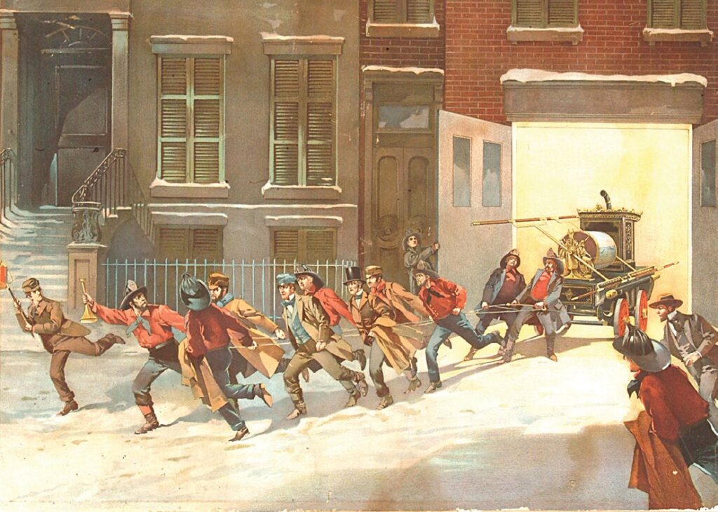 The general term scramble first came into use in the late 1500s and may have derived from the word “scramb” meaning to “pull together with the hands.”35 Overtime it has had various definitions, but one that relates to firefighters is “to move with urgency.”36 Back in the early days of the American Fire Service, firemen would be said to scramble when alerted by a fire alarm, gathering their tools and responding with haste to the fire. Also, a more regrettable aspect of the days of the early American Volunteer Firemen was the competition to be first on the fire, creating a rivalry between various independent fire companies. The firemen from a different fire company might scramble to control the nearest fire hydrant or “plug” for their engine company, actually fighting over it.