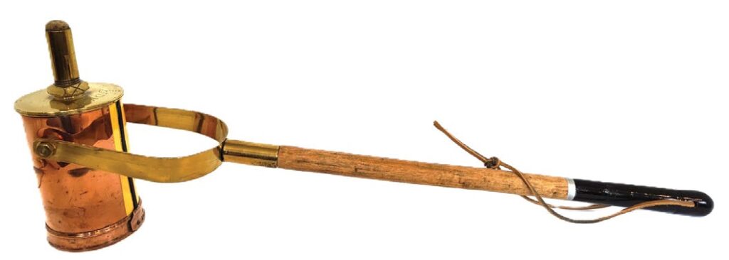 Besides the more standard fireman hand torches, fire equipment manufacturers came up with some unique adaptations and options. One was the “Improved Hat Torch” by Cairns & Brothers, c. 1890s. The small open torch assembly was designed to be clamped to the top “comb” of the fire helmet or to a parade hat. On the fire helmet, it could be used for both night parades or on the fire scene to identify the location of people working around the apparatus or hose men.11