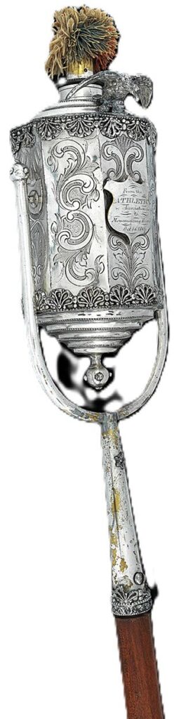 Though military insignia may have had some impact on firemen’s insignia, the first fire scrambles, at least in printed engravings, showed up prior to the Civil War. One part of heraldry symbolism that may have carried over to the fireman scramble was having equipment crossed in the center of the emblem. Chief Ronny Coleman related in his article The Badge that according to heraldry, crossed swords on an insignia represented “a person had gone to battle” or “it indicated a performance.”33 This relates to the symbolism of the Fireman scramble in that the pieces of equipment used in firefighting are grouped crossing each other in the center of the emblem showing they are used by the individual to battle fire.