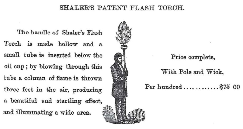 - “Shaler’s Patented Flash Torch”, Fred Millers Fire Apparatus and Fire Department Supplies, Brooklyn, New York, 1872, p. 24.