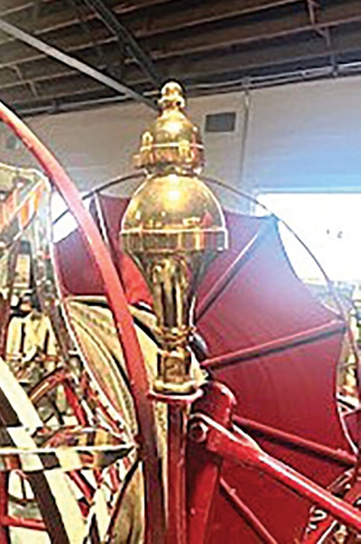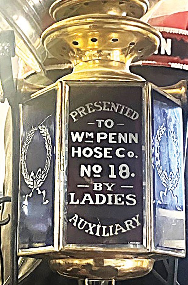 This ornamentation included adding mounted lighting to illuminate the apparatus for night parades, fire responses, or working around the apparatus at fire scenes. These devices began as simple mounted lanterns or lamps of tin housings with mica panels (translucent silicate a substitute for glass). They soon advanced to brass or copper housings with glass panels. To add to the embellishments, the brass could be silver or nickel plated, and the glass painted and engraved with fire company names or the apparatus company number.25 Apparatus lamp housings were more of a box shape with flat sides for glass, some with four sides and others designed as six-sided housings. Tops or chimneys of the lamp were round metal oval discs of multiple sizes. Some embellished lanterns had finials representing different figures, the most common being an eagle.26 Some of the more highly embellished apparatus lamps were made for parades only and removed afterwards, with more utilitarian lamps used on the apparatus for responding to fires.27