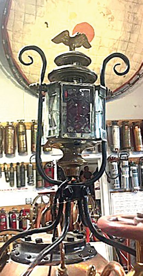 A popular working lantern for firemen of the day and now fire collectors is the Dietz “King” Fire Department Lantern, manufactured in tin, copper, or brass.18 This lantern design features “air tubes” coming off the chimney and flowing back down the sides to the burner assembly to preheat and feed air to the combustion process, increasing efficiency. It has a distinctive “wind or water guard” (shield), an approximately two-inch wide band that surrounds the top of the globe and chimney assembly to protect the lantern’s flame from being blown out by wind or water during response or fire ground operations.19 The lantern is stamped with “Fire Dep’t” and “Dietz King” circling the top of the fuel container base. The lantern stands 14.5 inches tall and with carrying handle extends 19 inches. The lantern carrying handle assembly has a small folding hanger wire that is used to help secure the lantern in an apparatus mounting bracket. The Dietz lantern survived past the steam era, and was equipment provided on motorized apparatus for dependable scene lighting up to the 1930s.20 The lantern today can be found in either a natural finish, polished, or painted with clear or colored globes. The Dietz Fire King is a highly prized item by fire museums and fire buff collectors as a representative of a true working lantern of the American Fire Service’s past.