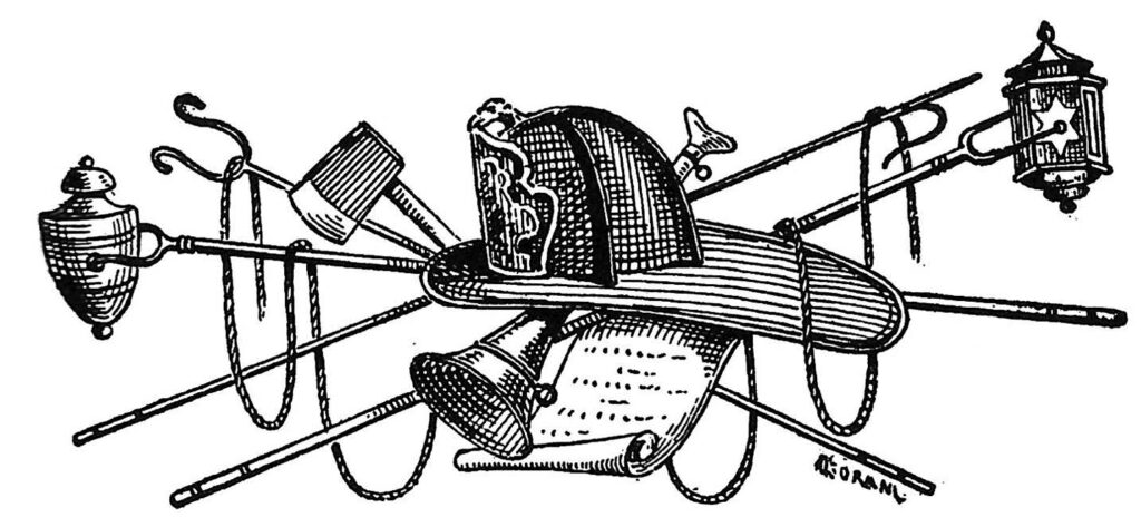 This chapter will cover the types of lighting equipment and its use by American Firefighters before the development of electric lights. Not only is it a fascinating history, but some of the images of this lighting equipment still has meaning and carries forward on some of the symbols used in fire service “Scrambles” on badges and emblems seen today. This symbol is an often misunderstood and misrepresented historic device in the fire service today.