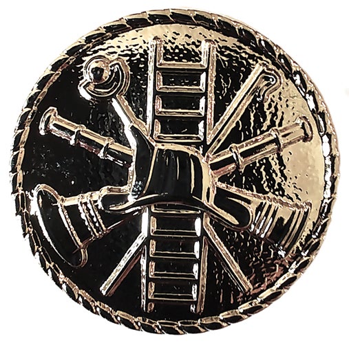 Early fire scrambles used in collar emblems or centered on badges contained a collage of various fire tools and equipment found in the fire service at the time. A traditional scramble might contain a side depiction of a traditional fire helmet centered over an upright ladder. Other various tools, such as a straight bore nozzle (play pipe) and a speaking trumpet, crossing each other. In addition, a pike pole and a torch pole were commonly crossed in the center as well. Finally working our way back around to early lighting and their symbols in the fire service. Later versions would add axes and other tools, with some removing the fire torch.