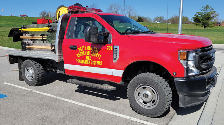 The South Central Buchanan County Fire Protection District recently put a new brush truck into service. The department has been without a devoted wildland fire vehicle for several years, using dual-purpose pickup trucks for natural cover fires. The Ford F350 was purchased through the Missouri Contract Purchasing program. The Heiman Fire skid unit as well as the radio and hand tools were purchased in cooperation with Missouri Department of Conservation grants. The Fire Protection District is in Northwest Missouri and covers 80 square miles with two firehouses in Buchanan County. It also covers calls on nearly 10 miles of Interstate Hwy. The District has strong mutual aid agreements with 8 surrounding fire departments and mutual aid calls add the District answering nearly 400 calls for service per year. The fire department members for the District are all volunteers.