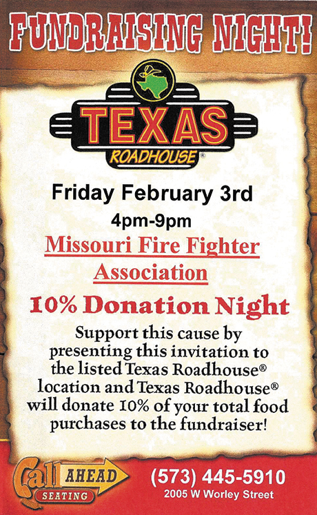 Second, Winter Fire School is approaching. For the third year we will be doing the fund raiser at Texas Roadhouse. Opposite in the newsletter is a flyer for the event. Cut that out and take it with you on Friday evening, February 3 between 4 and 9 p.m. and they will donate 10% of your check to our project. Last year we received over $500, the largest amount ever given by the Columbia restaurant. It will be crowded, but please be patient.