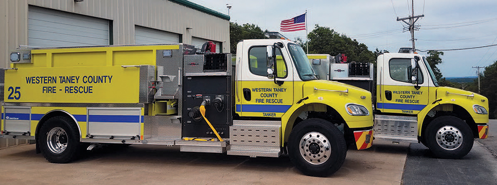 The Western Taney County Fire District received two 1,800 gallon tankers for the stations Hollister and Rockaway Beach. The Freightliner chassis have Rosenbauer aluminum bodies with 1,500 GPM Darley midship pumps in addition to carrying 400 GPM Darley portable pumps. The also have three dumps, three cross lays, a deck gun and carry a 1,000 feet of 5” supply hose. They replace two 24 year old Freightliner 1,550 gallon tankers which have been sold.